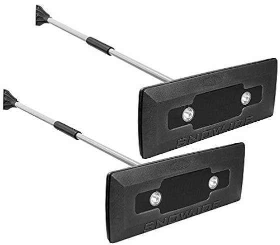 18 in. L x 7 in. W nonabrasive foam head pushes heavy, wet snow off vehicles without damaging paint, trim, or glass. Dual LED lights and emergency blinker function for nighttime illumination. Builtin ice scraper quickly clears icy buildup on windshields. Auto locking telescoping pole with foam grip adjusts from 30 in to 49 in.. 2 pack of black Snow Joe snow brooms. Best use: clearing snow and ice from cars and trucks, day or night