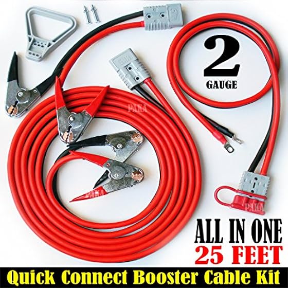 3 PCS- 2 GAUGE 25 FT QUICK DISCONNECT JUMPER-BOOSTER CABLE SET, TOW-SERVICE TRUCK THIS PROFESSIONAL BOOSTER CABLE CONTAINS 3 PCS ,AND IT IS TOTALLY 25 FT 2 GAUGE JUMPER / BOOSTER CABLES SET, TOW TRUCK, QUICK DISCONNECT PLUG IN. IT IS MADE OF FREE TANGLE FREE 2 GAUGE JUMPER CABLE. THEY HAVE FULLY SHIELDED HEAVY DUTY 800 AMP BATTERY CLAMPS. .IT IS MADE BY GREY SB175 QUICK DISCONNECT CONNECTORS AND THE BEST LUGS. ALL OF THE LUGS AND CONNECTORS ARE HYDRAULIC CRIMPED AND THEN VOVERED WITH ADHESIVE LINED HEAT SHRINK. WITH THIS KIT, YOU DONT HAVE TO OPEN THE HOOD TO USE THE JUMPER CABLES. THIS IS A QUALITY KIT MADE TO LAST. BY USING 3 th PIECE YOU ALSO CAN USE YOUR KIT AS A NORMAL BOOSTER CABLE. THE 2 GAUGE CABLE IS GOOD FOR JUMP STARTING VEHICLES FROM, SMALL CARS - LARGE CARS, TRUCKS AND EQUIPMENT AND MORE. THIS KIT INCLUDES THE FOLLOWING ITEMS BELOW: 1 - 5 FT CABLE WITH QUICK CONNECTOR AND DUST COVER ON ONE END, AND 3/8" HOGH QUALITY EYELETS ON THE OTHER (THIS CABLE MOUNTS PERMANENTLY TO THE BATTERY, RED TO POSTIVE, BLACK TO NEGATIVE) 2 - ABOUT 19 FT CABLE WITH QUICK CONNECTOR ON ONE END AND 800 AMP BATTERY CLAMPS ON THE OTHER (THIS CABLE PLUGS INTO THE PERMANETLY MOUNTED PLUG ON YOUR VEHICLE) 3 - ABOUT 1 FEET CABLE WITH QUICK CONNECTOR ON ONE END AND 800 AMP BATTERY CLAMPS ON THE OTHER END (YOU CAN CONNECT THIS ITEM TO ITEM 2 ,TO MAKE YOUR NORMAL 2 GAUGE BOOSTER CABLE 4- FREE BAG