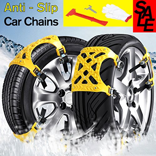 One size fits most cars, trucks and other automotives. One set includes 6 chains.. The car safety chains are easy to install for all men and women, no need to take down tires, safe to use and affordable. Made of pure steel & thicken pure TPU & steel studs, which does no harm to tires, lower noise, wearable and tough, anti-aging, grip firmly, ultra cold-resistant; has been approved by ISO. [ Great Sale, Newest Version, Original Seller, Genuine Car Snow Chains ] This anti-skip safety chains for cars works equally well whether you are stuck in sand, mud, ice or snow or climbing; cheaper alternative to snow chains. Include: 6pcs car snow tire anti-skid chains & portable packing bag & a pair of gloves & a snow brush; offering a smooth ride and better not on flat ground