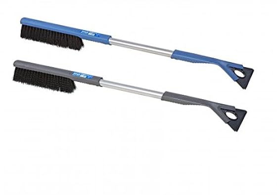Thick yet gentle brush removes wet and dry snow.. 3 scraping edges, ice breaker teeth with notch for cleaning wiper blades from ice and snow. Includes 2 snow brushes, black, blue and white handles. 3 year warranty. Ergonomically formed 20.5" long shaft.